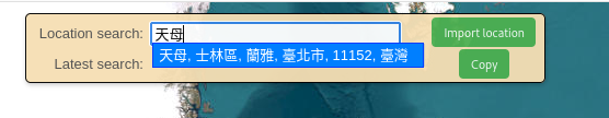 先不管確切範圍,在界面上方的搜尋欄輸入: "天母",就有下拉選單的資料,地名資料來自於OpenStreetMap的Nominatim,然後就有一個被標注在天母圓環的點位了 (這邊也不討論「真」天母圓環是那一個,那又是另一個故事了,這邊指的是天母東/西路跟中山北路,假日有市集的那個圓環),然後填上georeferencedBy (誰填的) 這個欄位就自動產生 locality 地名欄位的資訊: